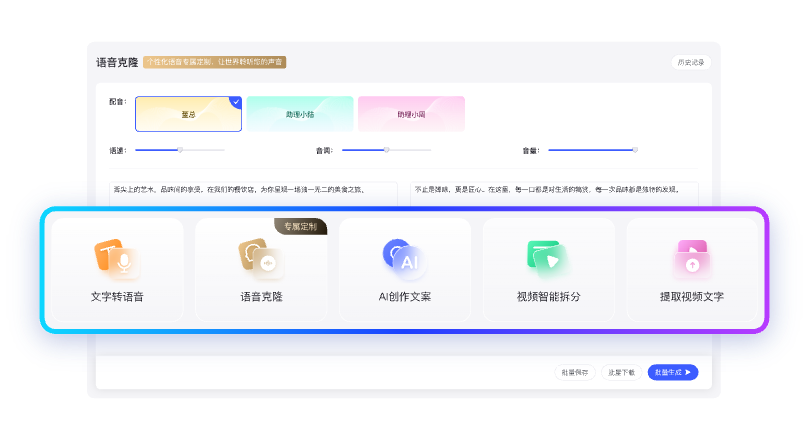 将文本转换为富有情感与质感的高保真人声,精准复制任何独特声纹,生成高度仿真的定制语音,让您的视频配音一步到位。