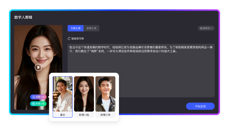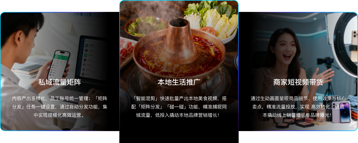 识别视频中的物体、场景变化和人物情绪,自动匹配对应的产品或场景画面;智能插入强调性的特效或图文标签。